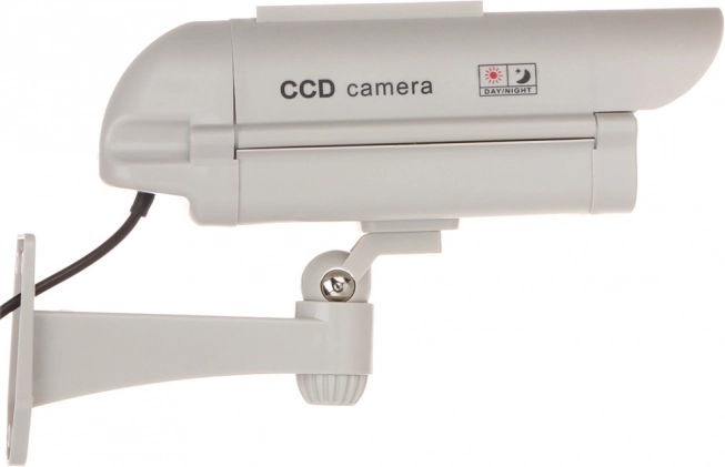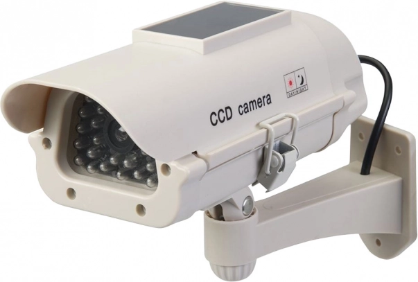 Denne kameradummy efterligner troværdigt et ægte CCTV-apparat, inklusive imitation af 28 infrarøde LED, en detaljeret linse og et kort tilslutningskabel. Den blinkende røde LED signalerer tilsyneladende drift og skaber indtryk af konstant overvågning, hvilket øger den præventive effekt.