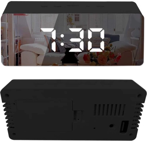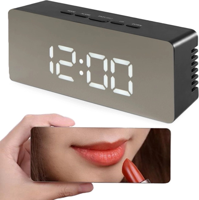 Det stilfulde LED-vækkeur kombinerer praktiske funktioner og et moderne look. Den spejlblanke skærm kan bruges til et hurtigt tjek af udseendet, og lysstyrken kan justeres, så uret ikke forstyrrer om natten og er perfekt læsbart om dagen. Det overskuelige LCD viser tiden i 12/24 t-format, dato og temperatur i °C eller °F.