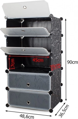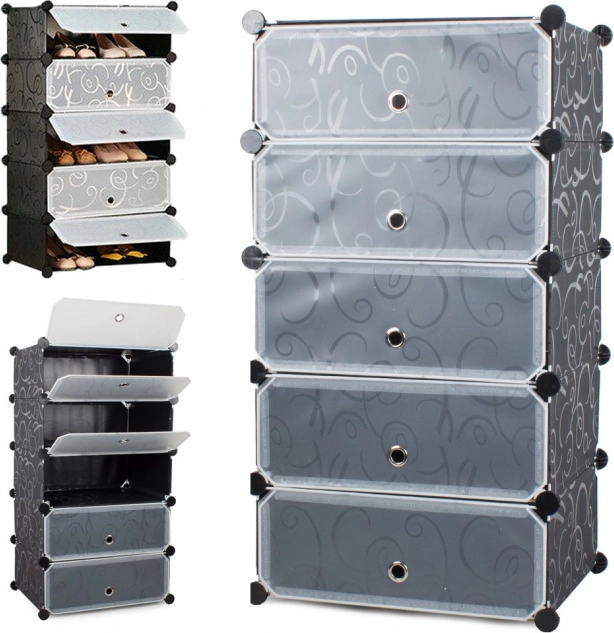Skoskabet har 5 hylder, som kan stables fleksibelt eller placeres ved siden af hinanden alt efter plads og behov. Konstruktionen er let og stabil, hvilket gør håndtering og montering nem. Takket være de gennemsigtige vinduer finder du hurtigt det, du leder efter. Skabets materiale er vandafvisende og kan nemt rengøres.