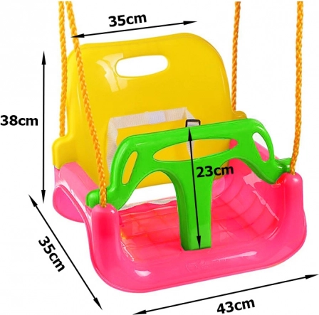 Farverig 3-i-1 børnegyngestol, der vokser med dit barn – fra et sikkert sæde til småbørn til en klassisk gynge til større børn. Takket være den modulære konstruktion, justerbar reblængde og sikkerhedssele tilbyder den maksimal sikkerhed, komfort og lang holdbarhed til brug i haven, på terrassen og indendørs.