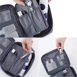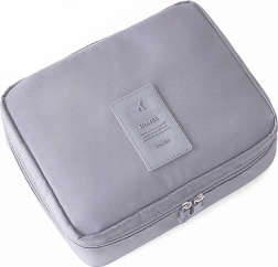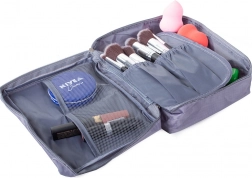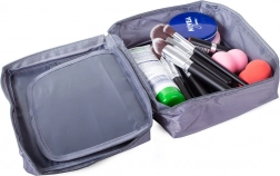 Den grå rejseorganisator til kosmetik giver rigelig plads til alle dine behov. Den har ét hovedrum og et udtrækkeligt kammer med to lommer, der kan lukkes med velcro, hvilket øger kapaciteten. Desuden indeholder den to netlommer til småting.