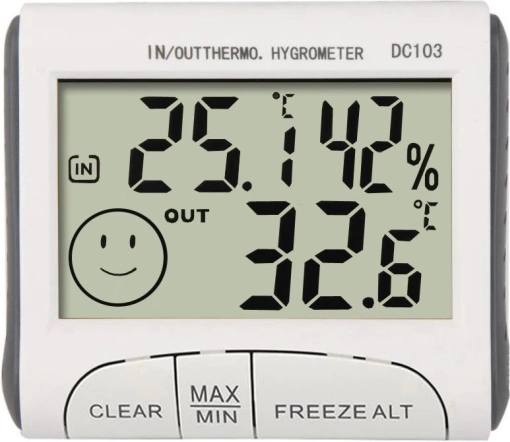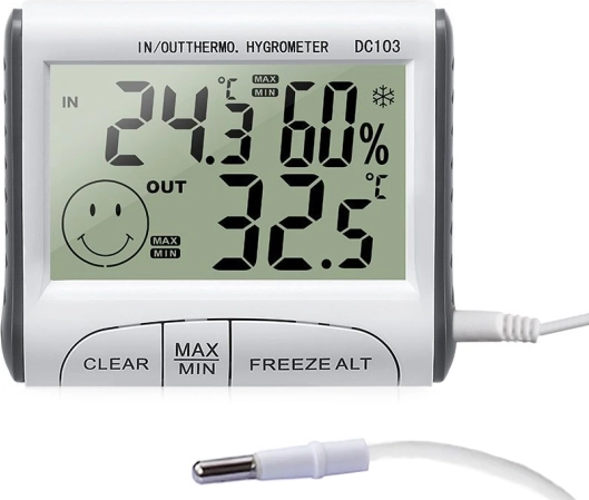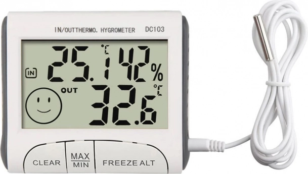 Hold det ideelle klima hjemme og på arbejdspladsen. Dette digitale termometer og hygrometer viser aktuel temperatur og luftfugtighed indendørs og med den robuste eksterne sonde også temperatur udendørs. Den overskuelige LCD-skærm suppleres af en grafisk smiley, der straks indikerer, om forholdene er komfortable.