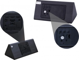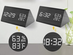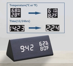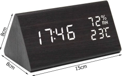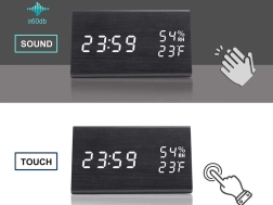 Designbordur i sort træeffekt passer perfekt til soveværelse, stue og kontor. Det multifunktionelle display viser tid, dato, temperatur (°C/°F) og luftfugtighed. Takket være lydstyring tændes skærmen i strømbesparende tilstand med et klap eller et let tap – ideelt især om natten.
