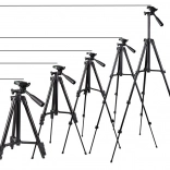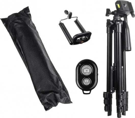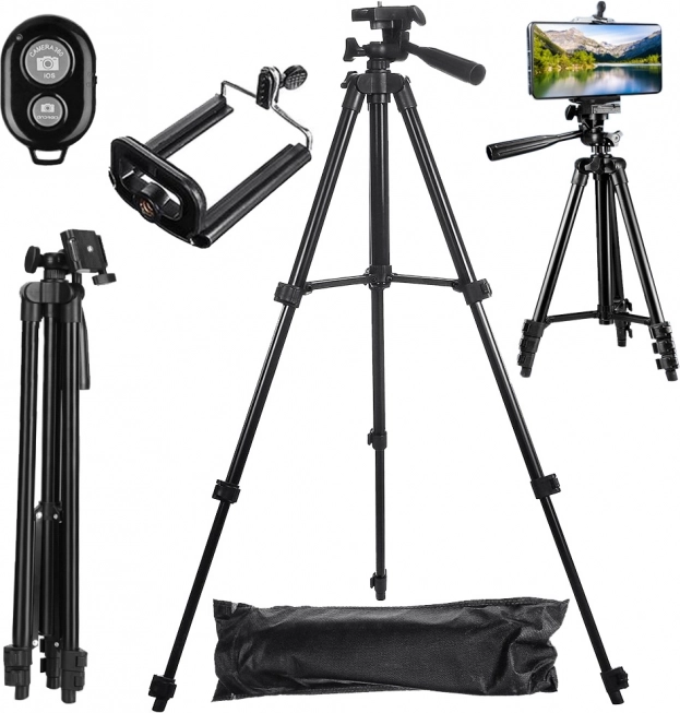 Let og stabilt stativ til smartphones og kameraer med universelt 1/4"-gevind og mobilholder. Tilbyder højde 32–100 cm, 360° drejehoved, teleskopiske ben og skridsikre fødder. Inkluderer Bluetooth-fjernbetjening til Android og iOS samt transportetui.