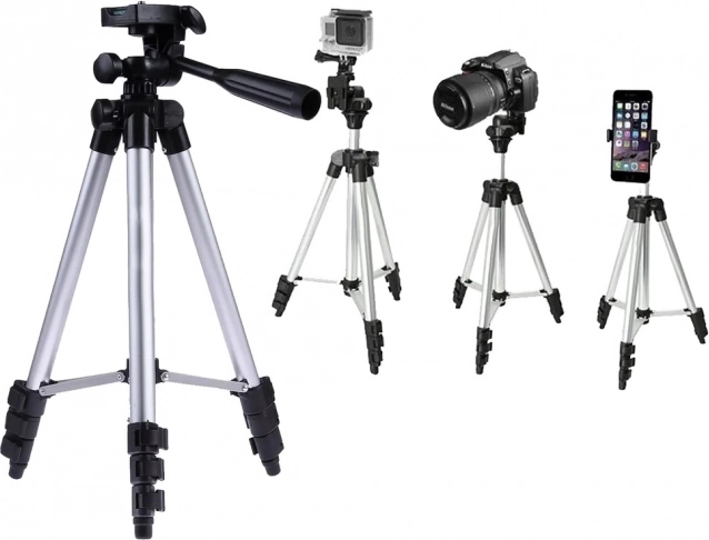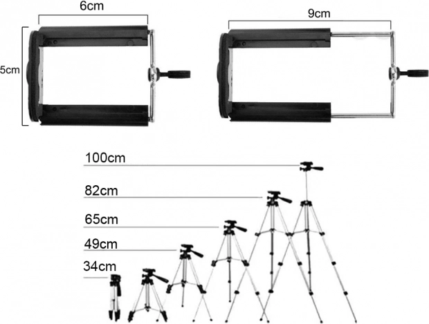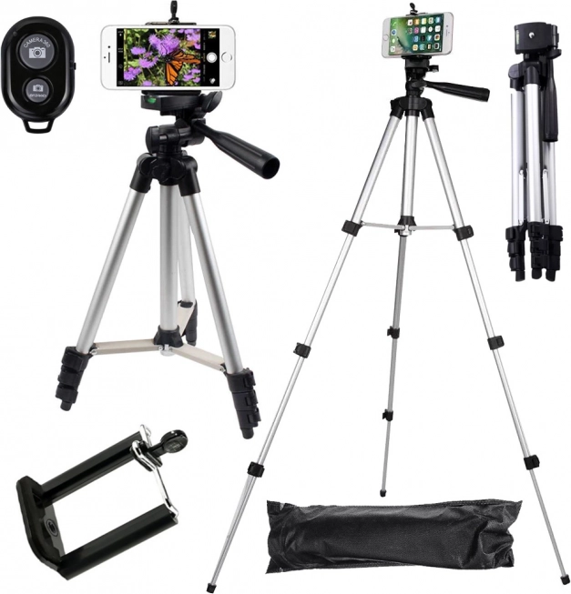 - Pakkeindhold: stativ, telefonholder, Bluetooth-fjernbetjening, transporttaske, original emballage