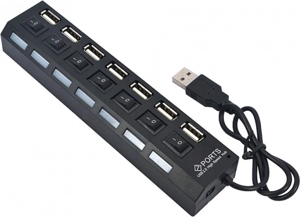USB-hubben er den ideelle løsning til tilslutning af op til 7 enheder samtidigt. Hver port er udstyret med en individuel ON/OFF-kontakt og en blå LED, der indikerer status for hver port.