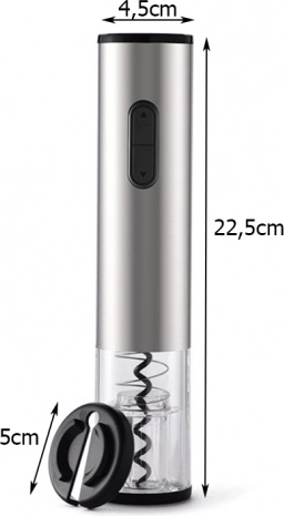 Åbneren drives af 4 AA-batterier, hvilket giver frihed uden kabler. I pakken finder du også en folieskærer til nem fjernelse af aluminiums- eller plastikfolien omkring flaskehalsen.