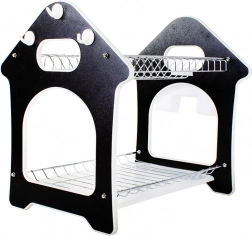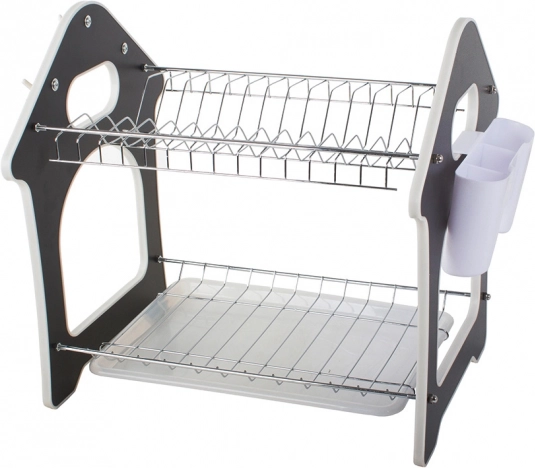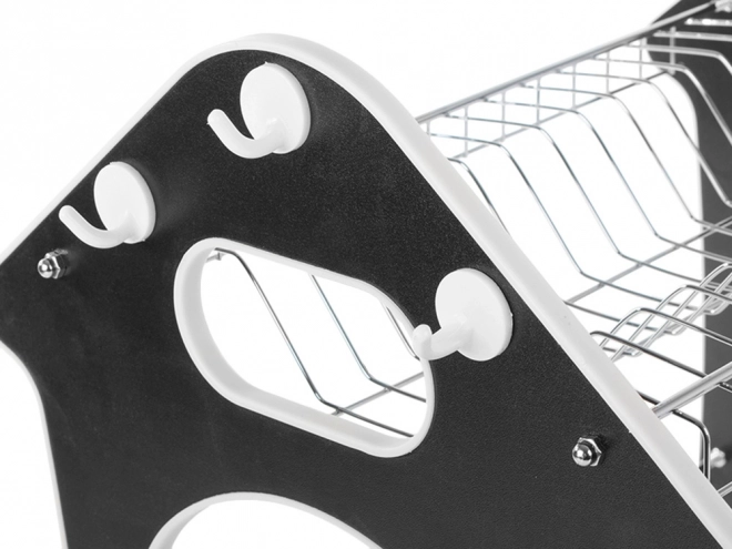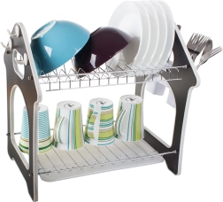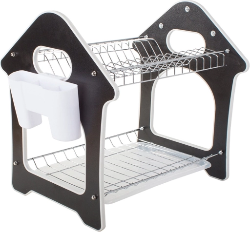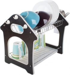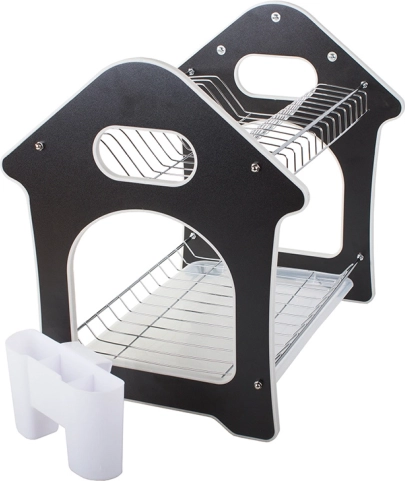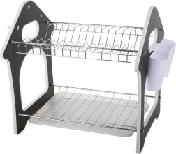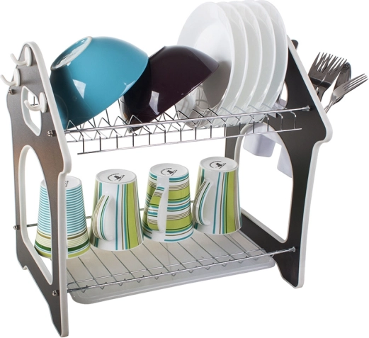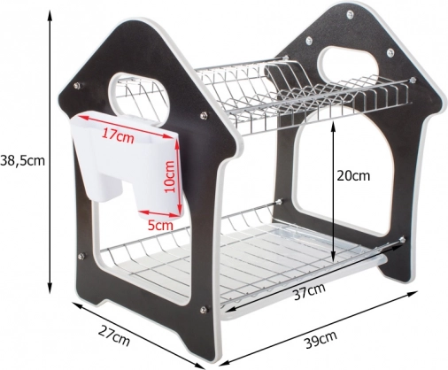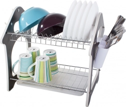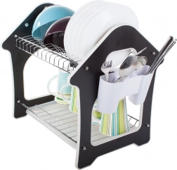 Dette to-niveaus opvaskestativ udnytter den lodrette plads effektivt og rummer op til 14 tallerkener på den øverste hylde, mens den nederste hylde er ideel til skåle, krus og glas. Medfølger gør en aftagelig bestikholder, der kan placeres på valgfri side, samt tre kroge til ophængning af køkkenredskaber.