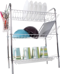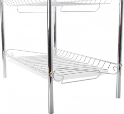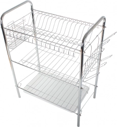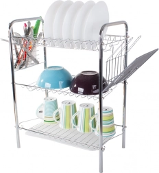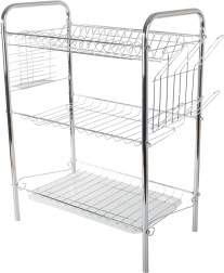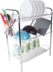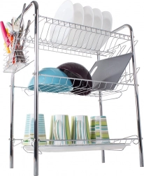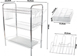 Det tre-etagers opvaskestativ er en ideel løsning til ethvert køkken, hvor pladsen skal udnyttes effektivt. Den robuste metal konstruktion med kromlook er holdbar og let at vedligeholde. Takket være den gennemtænkte opdeling placerer du tallerkener i de lodrette rum, skåle og fade på hylderne og kopper eller glas på nederste niveau.