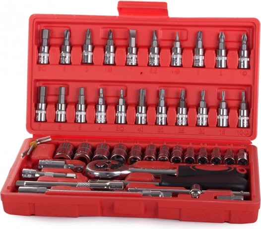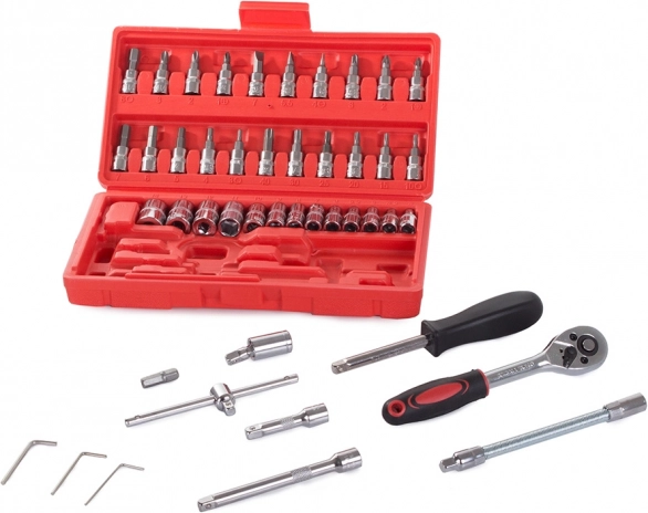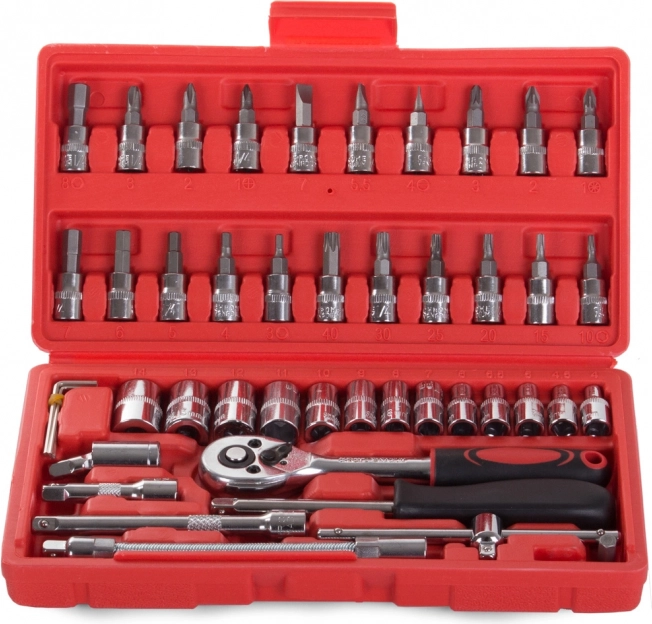 Oplev alsidighed og pålidelighed med dette 46-delte værktøjssæt. Et perfekt valg for både gør-det-selv-folk og professionelle, der har brug for altid at have de nødvendige nøgler og bits ved hånden.