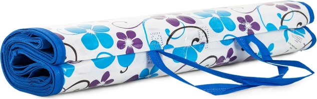 Måtten foldes og bindes let, så den fylder meget lidt i sammenfoldet tilstand og har et praktisk bærehåndtag – den ligner en lille håndtaske.