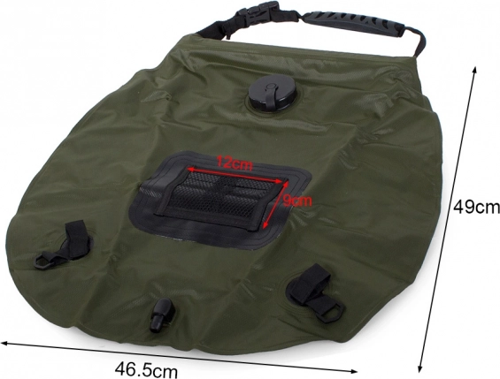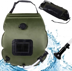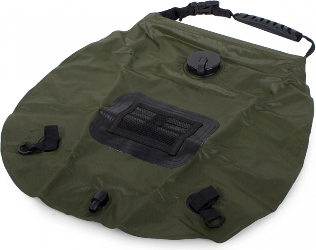 Det ergonomiske gummihåndtag gør det lettere at bære og hænge op. På forsiden finder du en netlomme til sæbe eller shampoo samt praktiske kroge til at fastgøre brusehovedet, så du kan stoppe vandgennemstrømningen uden spild. I sammenfoldet tilstand fylder bruseren minimalt, så den er perfekt til rygsækken eller bilen.
