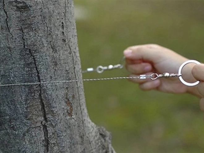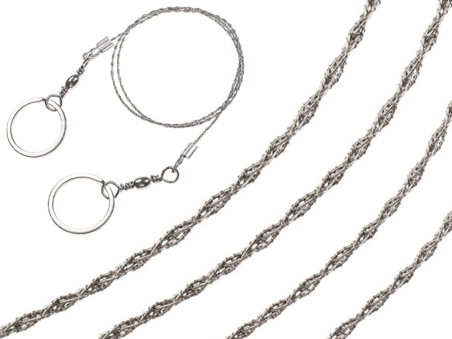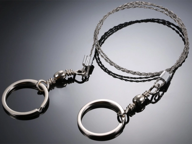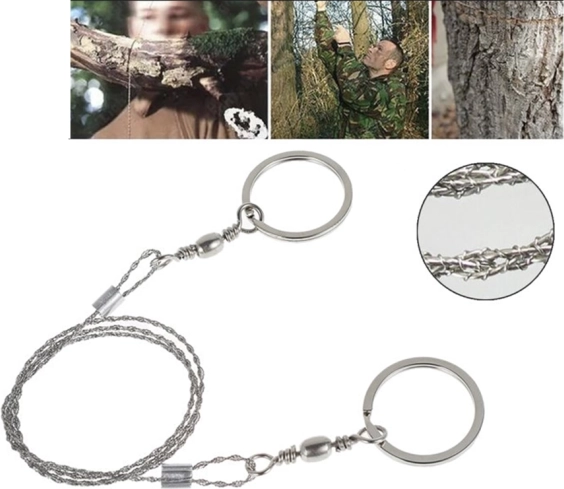 Den praktiske trådsav er en uundværlig del af enhver survival-, EDC- og campingpakke. Det flettede rustfri kabel med tusindvis af fine tænder sikrer hurtig og effektiv skæring med minimal vægt. Metalringene kan holdes direkte eller udvides med træpinde for endnu mere komfortabelt arbejde.