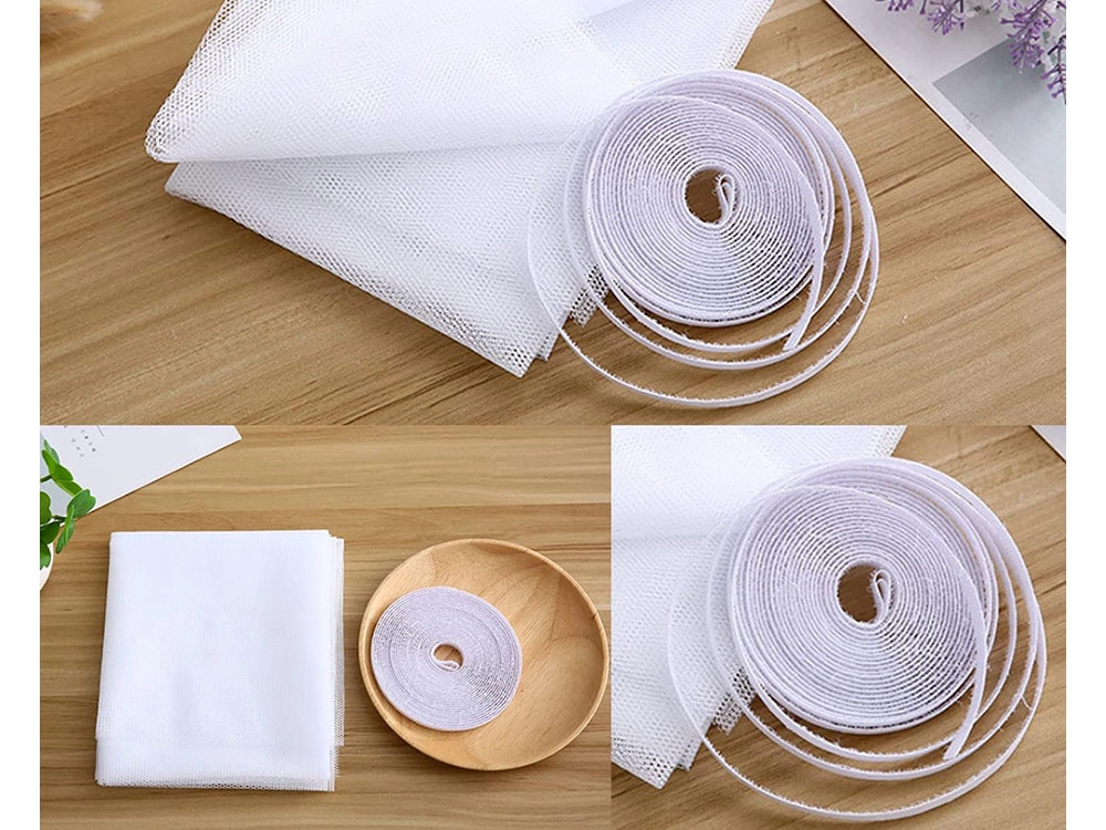 Installationen tager kun få minutter: sæt velcroen på rammen, læg nettet på, klip overskuddet af – og du er færdig. Materialet er holdbart, vaskbart (30 °C) og egnet til genbrug. Målet 180 × 150 cm kan nemt tilpasses de fleste vinduer og altandøre.