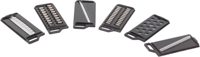 Sættet indeholder seks forskellige klinger til alle typer skæring, herunder tynde og tykke strimler, skiver og bølget design.