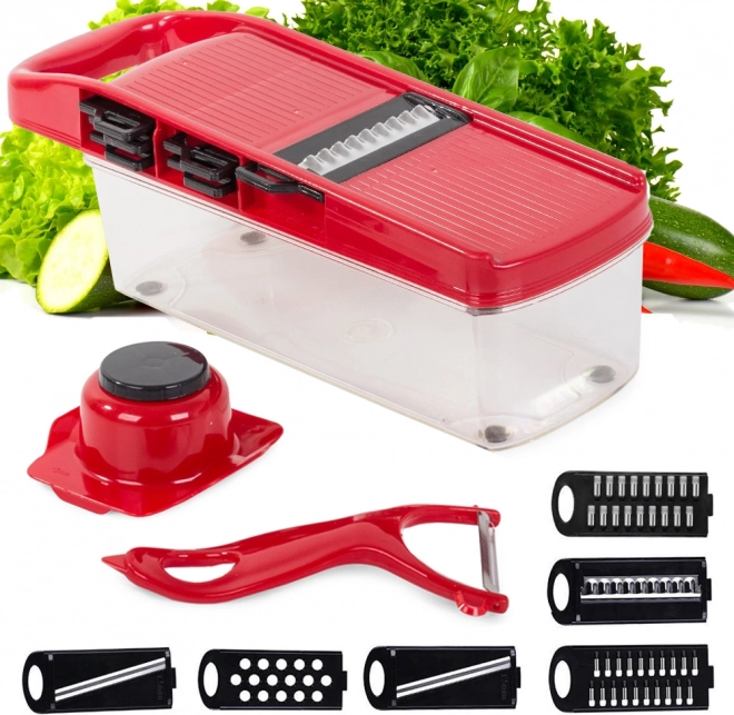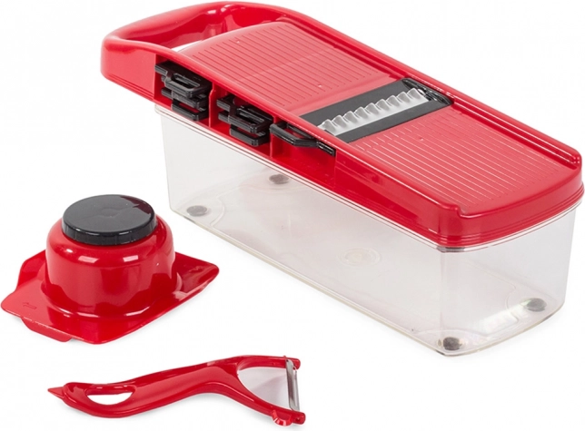 Rødt plastkomponent og gennemsigtig beholder gør det nemt at bruge og overvåge mængden af forarbejdede grøntsager.