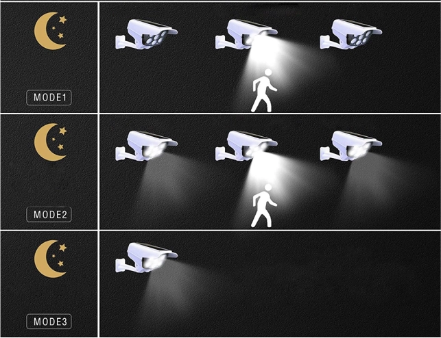 Der er tre tilgængelige tilstande: fuld belysning ved bevægelsesdetektering, økonomitilstand og konstant lys, hvilket giver fleksibilitet i forhold til dine behov.