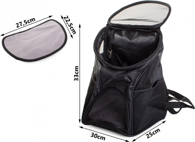 Rygsækken åbnes fra toppen med lynlås og indeholder en aftagelig indsats for nem vedligeholdelse. Integrerede netelementer sikrer god luftcirkulation, hvilket bidrager til komforten af dit kæledyr.