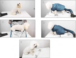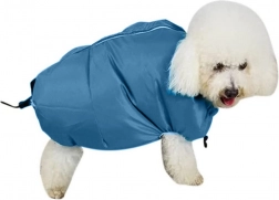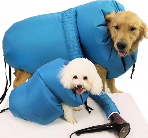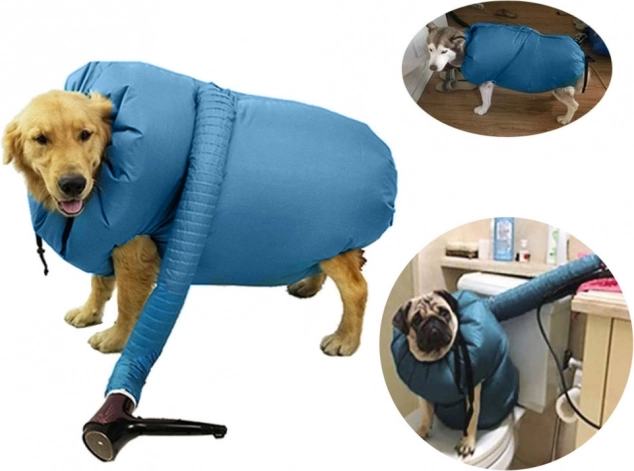 Farvel til kamp med håndklæder og våde poteaftryk i hjemmet. Tørrejakken til hunde af vandafvisende tekstil omslutter dyrets krop og sikrer via tilførsel af varm luft fra hårtørreren hurtig, effektiv og sikker tørring efter bad, svømning eller regn. Justerbare snører og velcrolukning hjælper med at tilpasse pasformen til forskellige hundestørrelser.