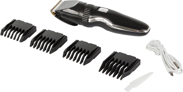 - Trimmer, 4 afstandskamme (3/6/9/12 mm), USB-kabel, kam, rengøringsbørste, olie, beskyttelsesdæksel, etui
