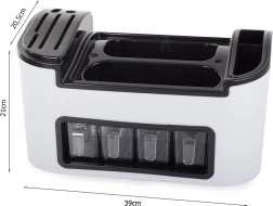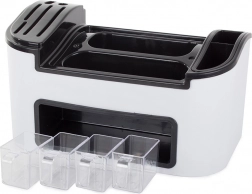 Den nederste del af organisatoren indeholder fire rummelige skuffer af æstetisk gennemsigtig plast, ideelle til opbevaring af kaffe, te eller sukker. Hver del af organisatoren er let aftagelig for grundig rengøring, og basen fungerer som en drypbakke for at sikre tørhed.