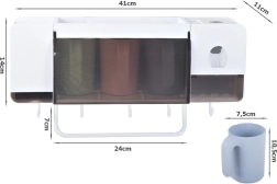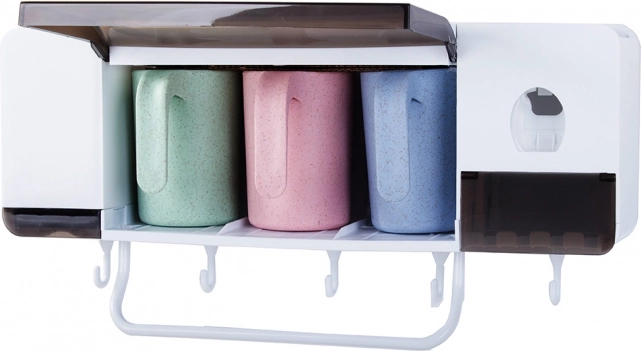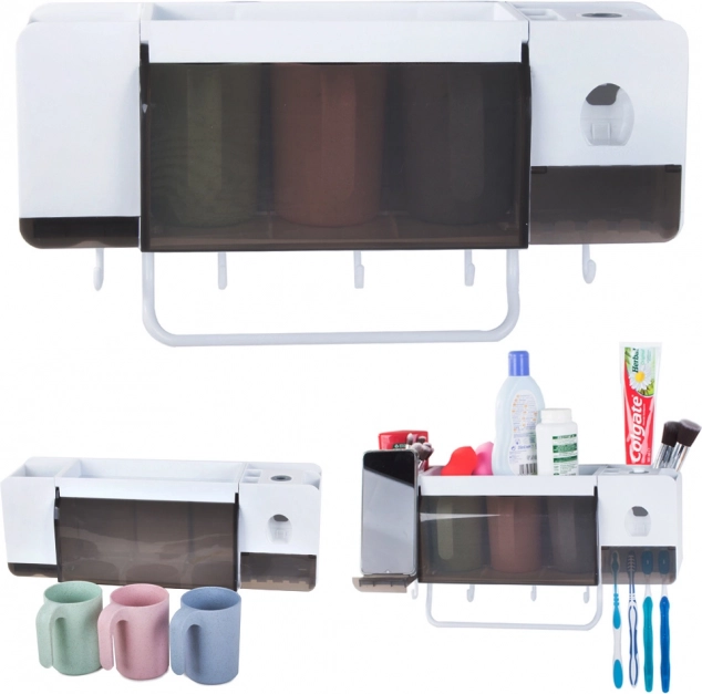 Den smarte badeværelsesorganizer kombinerer opbevaring til tandbørster, tandpasta og kosmetik i én kompakt enhed. Den automatiske tandpastadispenser gør den daglige hygiejne nemmere, mens rum til tilbehør rummer cremer, makeupbørster og deodoranter. Tre holdbare plastkopper (300 ml) er ideelle til hele familien.