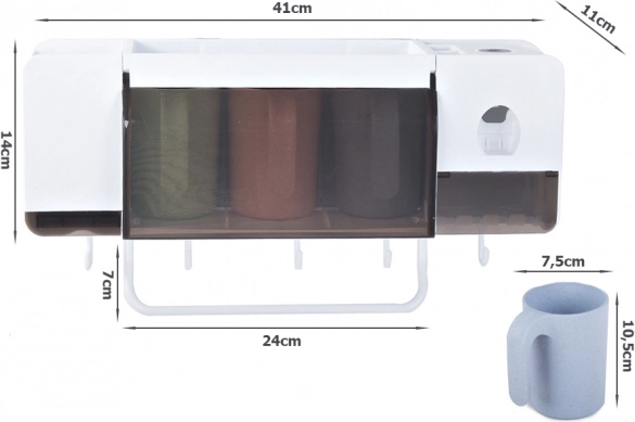 Hold badeværelset perfekt organiseret med denne vægmonterede tandbørste- og koporganizer med indbygget tandpastadispenser. Den tilbyder praktiske rum til kosmetik, 3 kopper på 300 ml, kroge til tandbørster og nem vægmontering med sugekop. Den stabile konstruktion med bæreevne op til 5 kg og integreret håndklædeholder sikrer orden og pladsbesparelse.