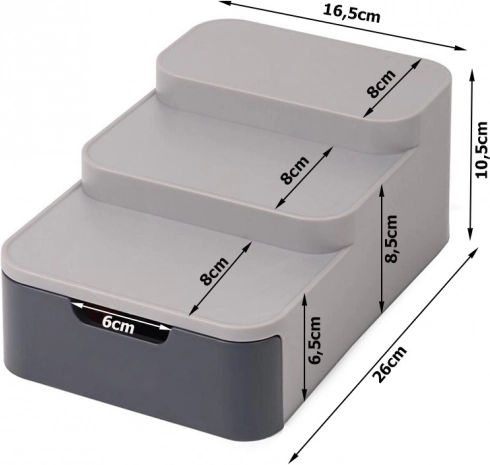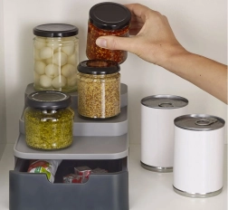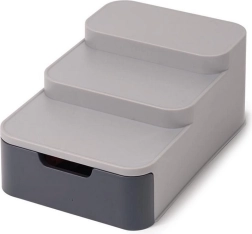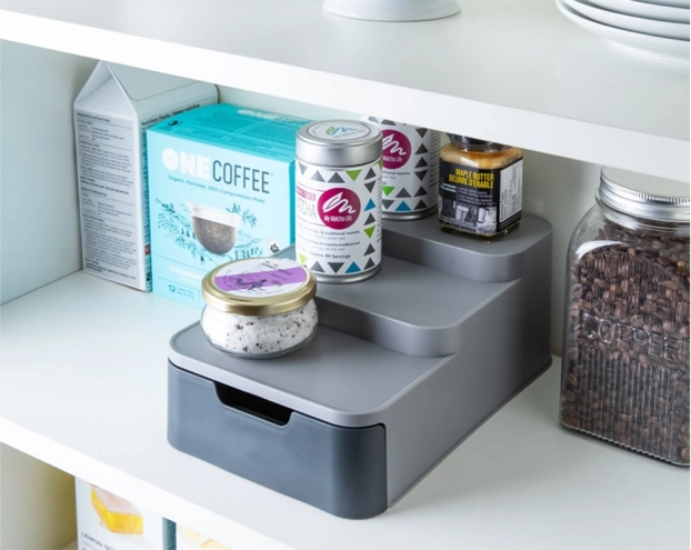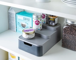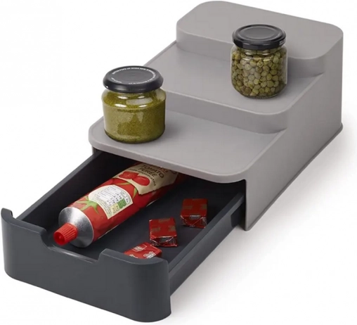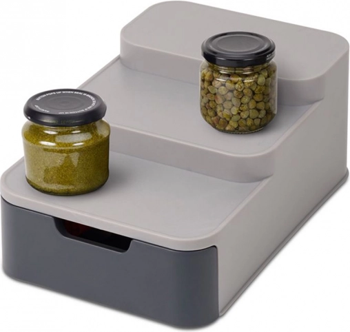 Denne kompakte organizer udnytter effektivt pladsen i dit spisekammer eller skab. Tre trin giver bedre synlighed af glas og dåser i bagerste række, mens den udtrækkelige skuffe rummer poser, tuber og andre småting. Den holdbare plast i grå farve er let at rengøre og passer perfekt ind i det moderne køkken.