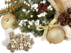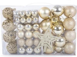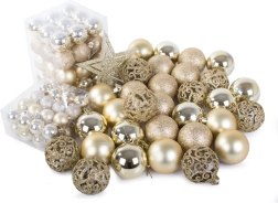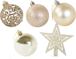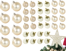 Sættet inkluderer pynt i forskellige størrelser og mønstre, der vil give dit træ et nobelt udseende.