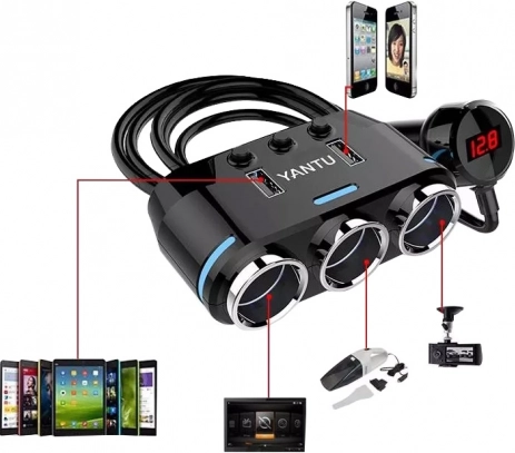 Tre cigarettændersokler og to USB-porte gør det muligt at oplade og forsyne flere enheder samtidigt – telefon, tablet, navigation og kamera.