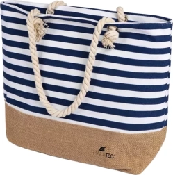 Blå-hvide striber og en bund i jute-look giver et friskt sommerudtryk. Kraftige rebhåndtag sikrer behagelig bæring, selv når tasken er fuldt pakket.