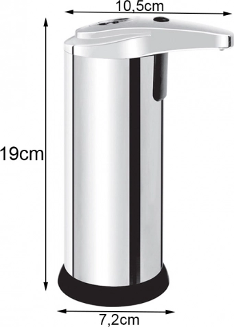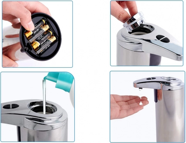 For brug, tryk blot på tænd/sluk knappen i en længere periode. Strømforsyningen sikres med fire AAA-batterier. Dispenseren er ideel til desinfektionsmidler takket være det kontaktløse system, der minimerer spredningen af bakterier.