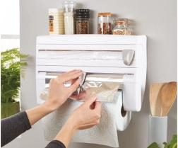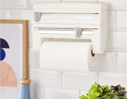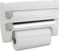 To dispensere til folie, en holder til køkkenrulle og en øverste hylde til krydderier eller småting samler køkkenets nødvendigheder ét sted og frigør plads på køkkenbordet.