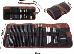 Alt er overskueligt organiseret i et robust etui med lomme og 39 elastiske stropper, som beskytter værktøjerne mod skader og rod. Etuiet kan hænges på staffeli eller fæstes i taljen for maksimal komfort ved arbejde i atelier og i felten.